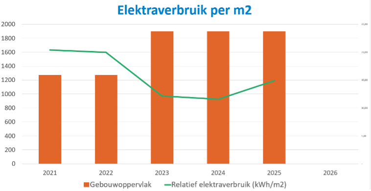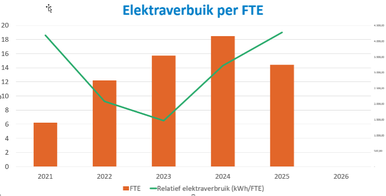 De voortgang van de CO₂-reductiedoelstellingen is weergegeven in de onderstaande grafiek. Wanneer we kijken naar het verbruik per m2 meter of per FTE zien we een stijging van de relatieve uitstoot in 2025. Ondanks dat op peildatum 31-12-2025 er minder FTE's werkzaam waren ten opzichte van een jaar eerder, hebben de medewerkers die vertrokken zijn wel nog invloed gehad op de uitstoot. Dit omdat 3 van hen elektrisch auto's reden. Ook zien we een groei als gevolg van het in gebruik nemen van laadpalen bij het pand. Hierdoor wordt er veel meer opgeladen aan de zaak, ook door medewerkers die geen auto van de zaak hebben.