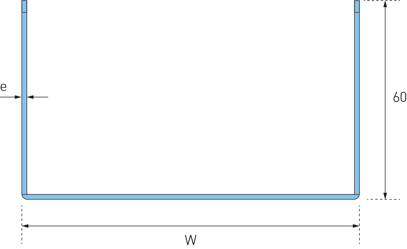 Bocht 90° voor Kabelgoot ECT60 met maatvoering H=60mm, B=100mm, D=1,0mm, 90°, roestvrijstaal 304, inclusief 8x EFS08x15-304 Eurostrut bevestigingsset (slotbout M08x15, moer en sluitring).