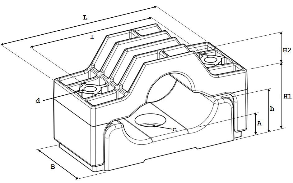 Design: The TRI eco clamp consists of a lower shell and an upper shell and is designed for mounting three cables in a triangular formation. The TRI eco clamp features two mounting holes for threaded rods or tap bolts. Both the upper and lower shells are equipped with integrated chambers, allowing the nuts at the bottom as well as in the center to be neatly retained within the clamp. In addition, the lower shell is provided with a central mounting hole, offering additional installation options.