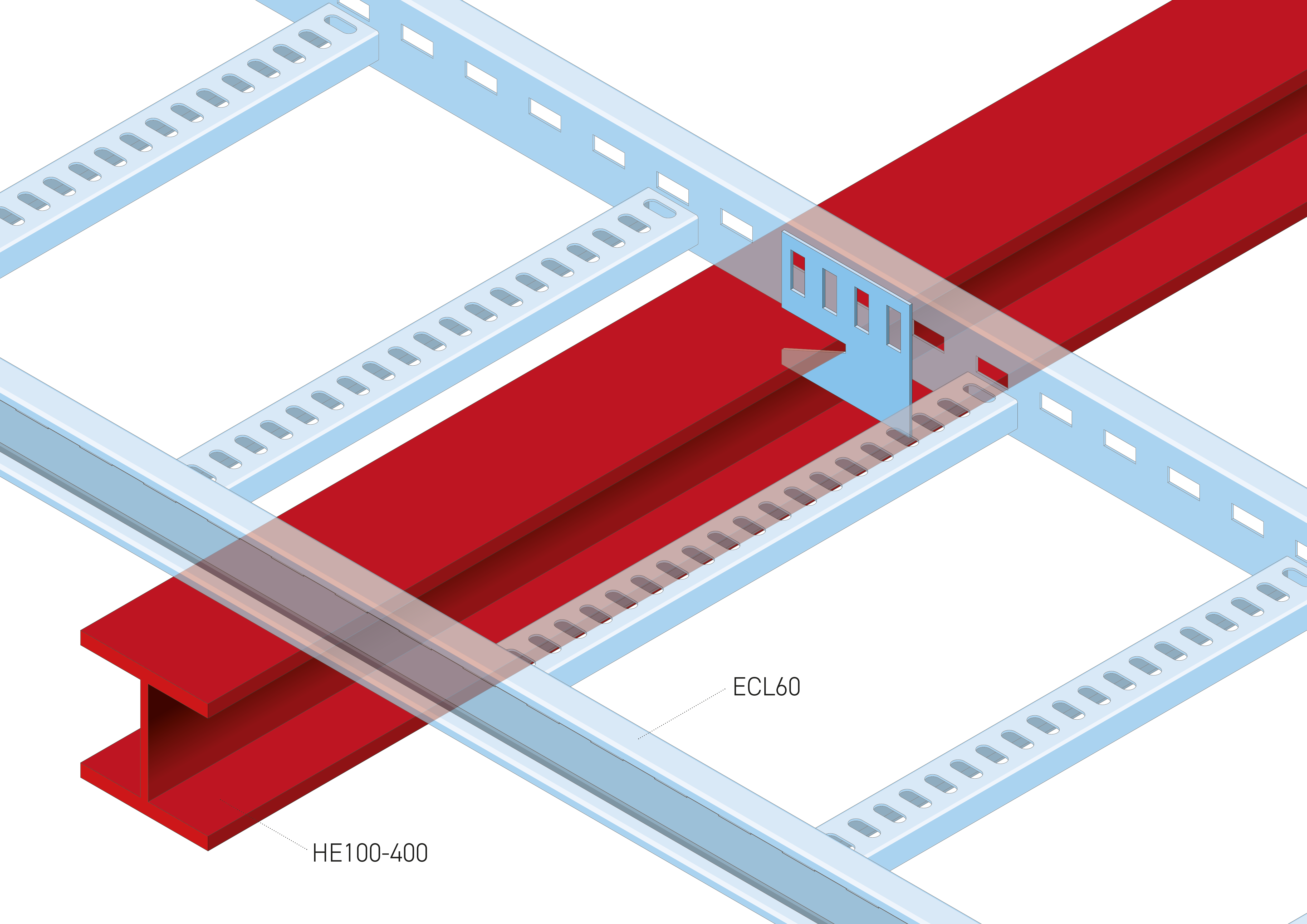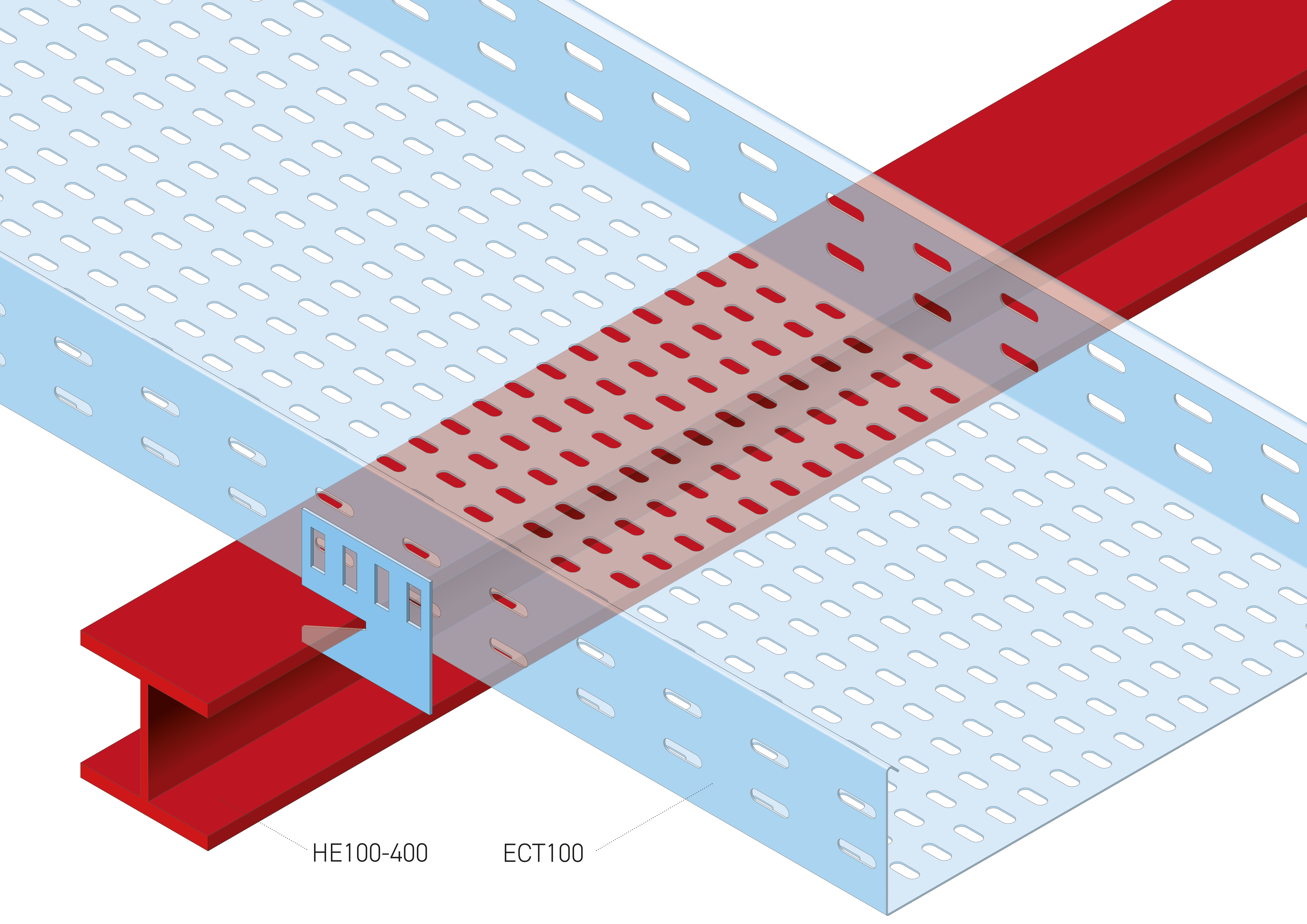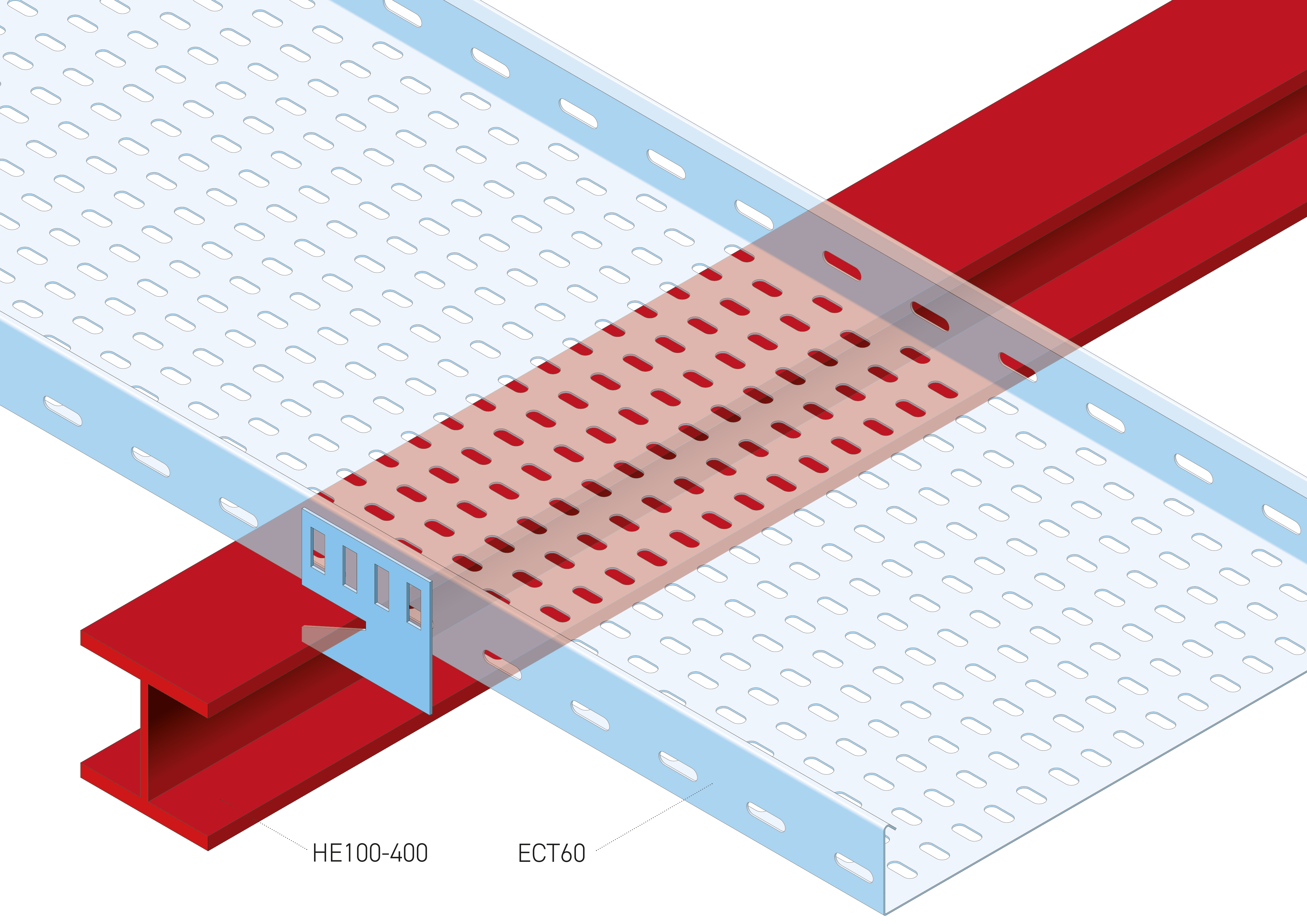For Eurostrut Cable Trays ECT60 and ECT100 and Cable Ladder ECL60, L=mm, W=100mm, E (thickness)=2,0mm, Carbon Steel Hot Dip Galvanized according to NEN-EN-ISO 1461, minimum layer thickness 60 µm, thickness layer minimum 60 µm. Clamping range HE100 to HE400.