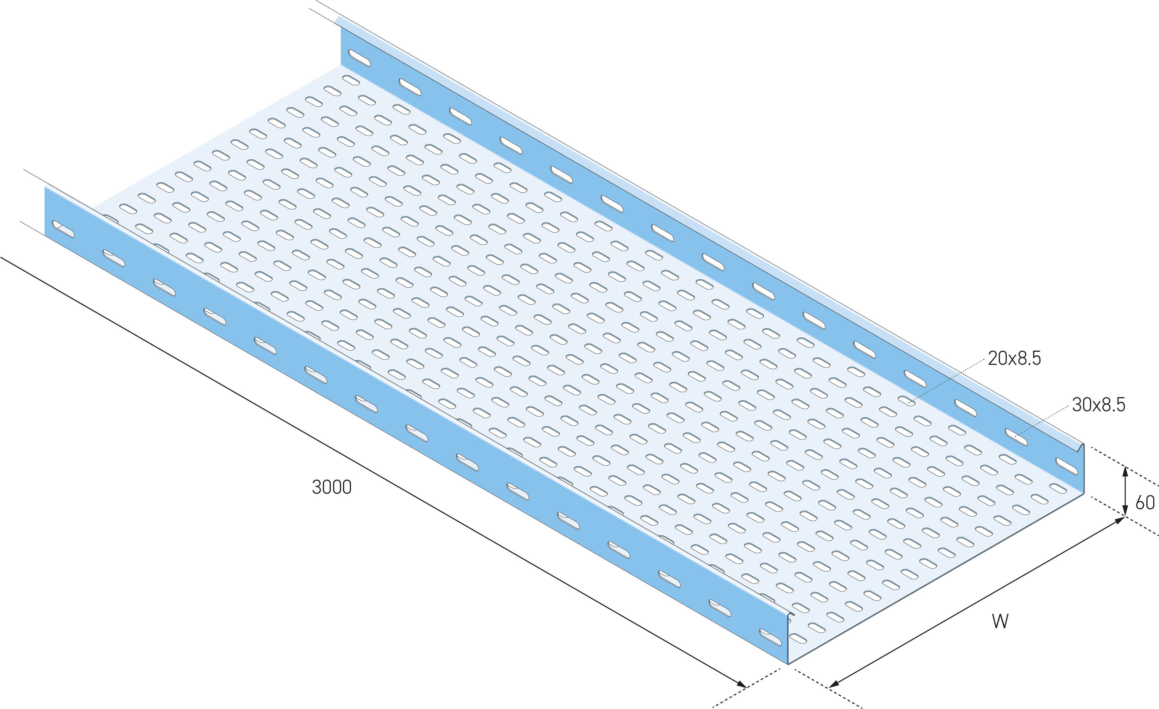 Kabelgoot 60x100mm RVS304 met afmetingen H=60mm, B=100mm, D=0,8mm, L=3000mm, roestvrijstaal 304, geperforeerd.