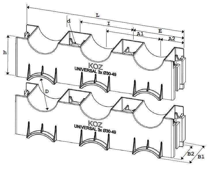 Ontwerp: Het UNI blok bestaat uit één deel dat zowel de functie van onderschaal als bovenschaal vervult. Het is ontworpen voor een eenvoudige installatie van kabels in een platte configuratie, waarbij meerdere kabels naast elkaar en/of boven elkaar worden geplaatst. Voor het klemmen van één laag kabels dienen minimaal twee UNI blokken te worden toegepast.
