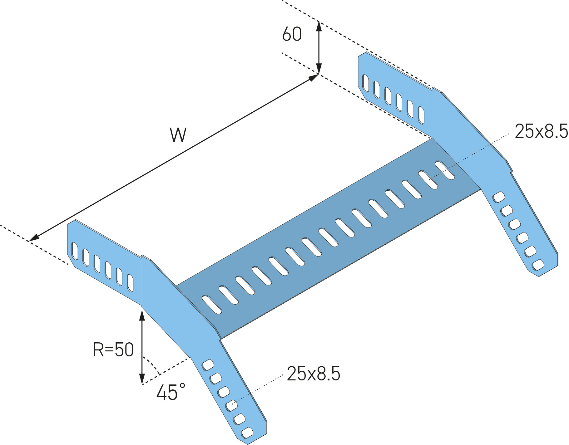 Valstuk 45° voor Kabelgoot ECT60 met maatvoering H=60mm, B=75mm, D=1,0mm, 45°, roestvrijstaal 316, inclusief 8x EFS08x15-316 Eurostrut bevestigingsset (slotbout M08x15, moer en sluitring).