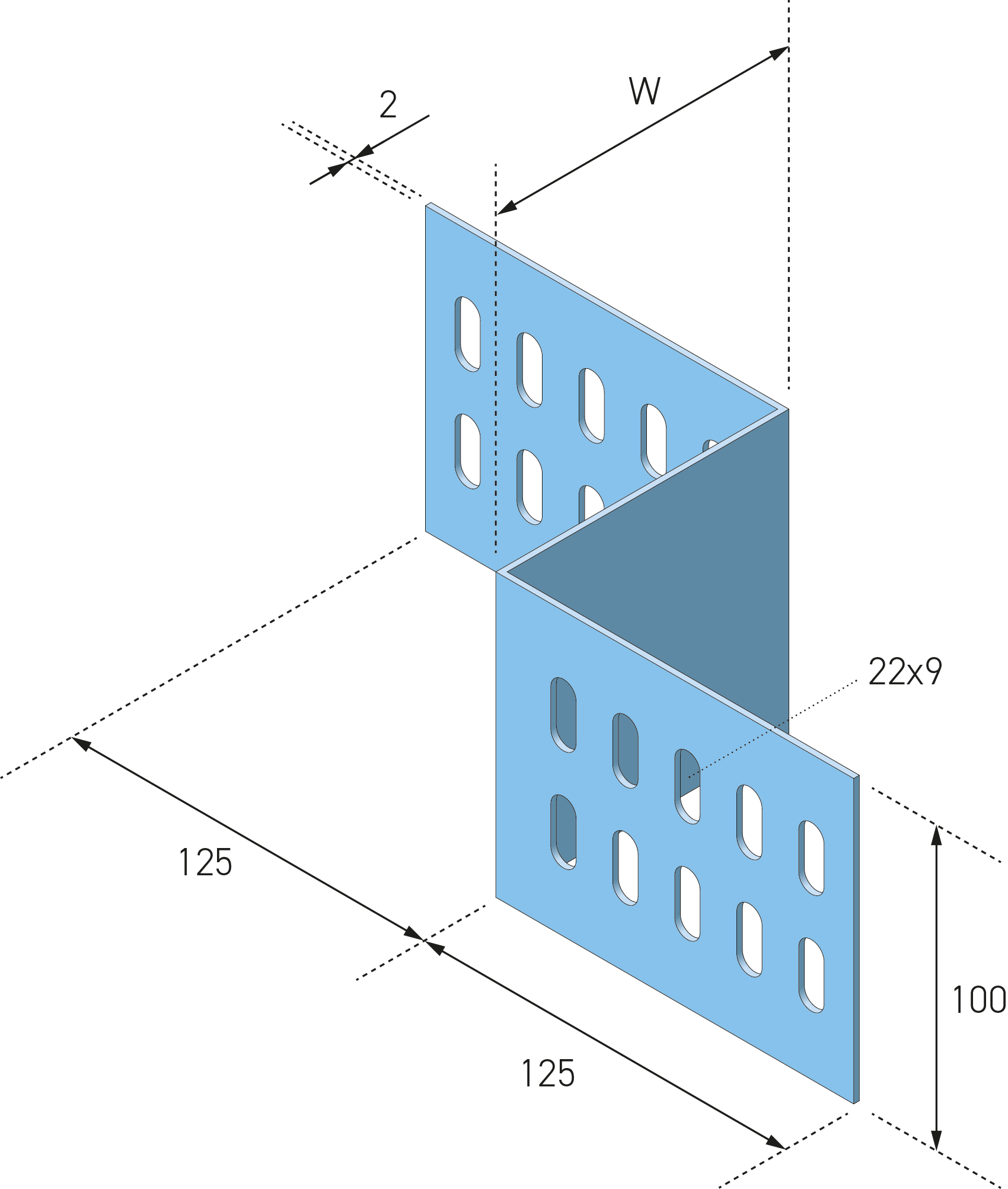 Verloopstuk Links Kabelgoot ECT100 100x125 RVS304 met maatvoering H=100mm, W (breedte)=125, E (dikte)=2,0mm, roestvrijstaal, inclusief 8x EFS04x15-304 Eurostrut bevestigingsset (slotbout M04x15, moer en sluitring).